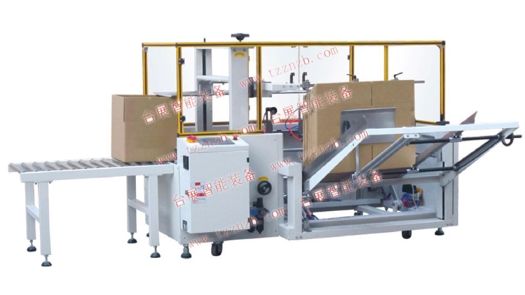 自動完成開箱、成形、下底折葉折曲.并實(shí)時完成下部分膠帶粘貼,將疊成紙板的箱板自動打開,箱子底部按一定程序折合,并用膠帶密封后輸送給裝箱機(jī)的專用設(shè)備。